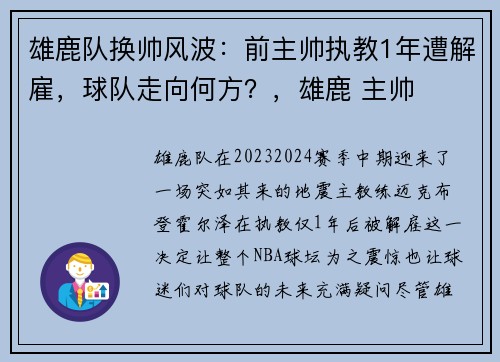 雄鹿队换帅风波:前主帅执教1年遭解雇,球队走向何方?,雄鹿 主帅