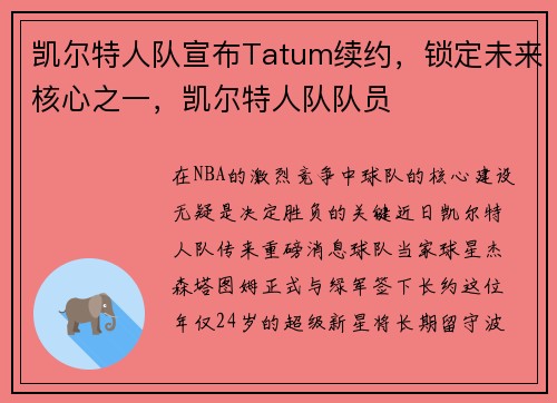 在NBA的激烈竞争中,球队的核心建设无疑是决定胜负的关键。近日,凯尔特人队传来重磅消息:球队当家球星杰森·塔图姆正式与绿军签下长约,这位年仅24岁的超级新星将长期留守波士顿,继续带领球队向更高的目标迈进。这一续约消息不仅是对塔图姆个人实力的...