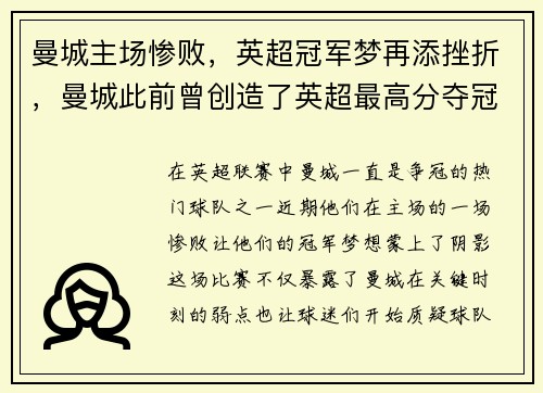 曼城主场惨败,英超冠军梦再添挫折,曼城此前曾创造了英超最高分夺冠