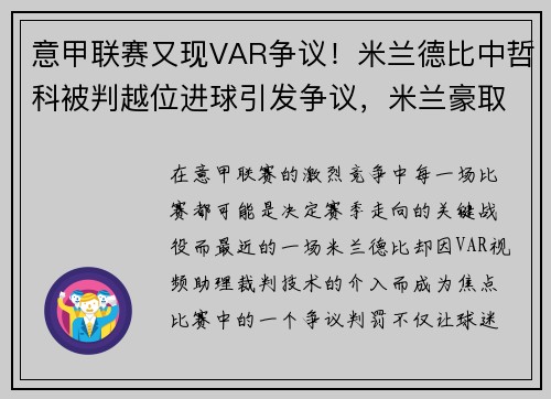 意甲联赛又现VAR争议!米兰德比中哲科被判越位进球引发争议,米兰豪取6连胜登顶意甲