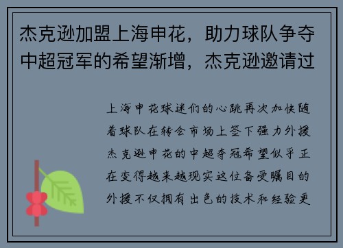 杰克逊加盟上海申花,助力球队争夺中超冠军的希望渐增,杰克逊邀请过的华人