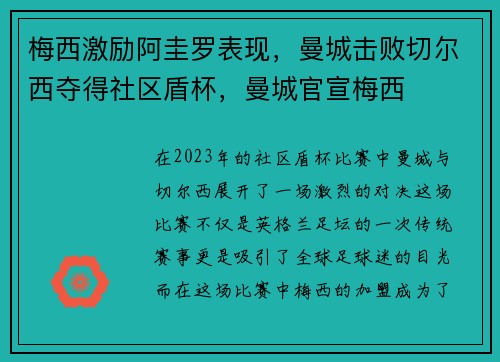 梅西激励阿圭罗表现,曼城击败切尔西夺得社区盾杯,曼城官宣梅西