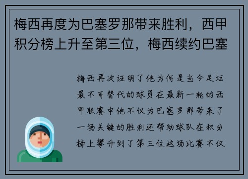 梅西再度为巴塞罗那带来胜利,西甲积分榜上升至第三位,梅西续约巴塞罗那2022封王之战