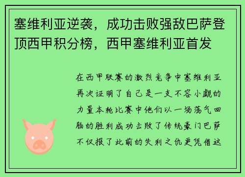 塞维利亚逆袭,成功击败强敌巴萨登顶西甲积分榜,西甲塞维利亚首发