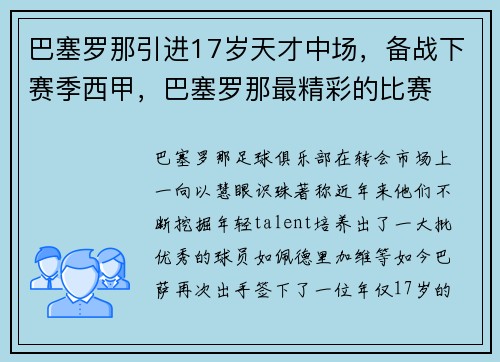 巴塞罗那引进17岁天才中场,备战下赛季西甲,巴塞罗那最精彩的比赛