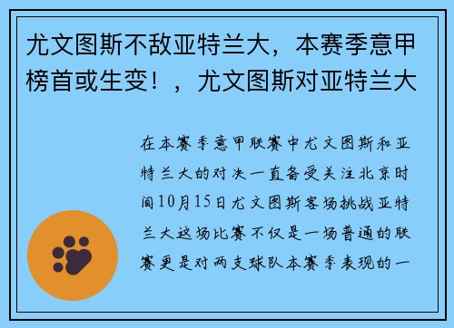 尤文图斯不敌亚特兰大,本赛季意甲榜首或生变!,尤文图斯对亚特兰大意大利杯决赛