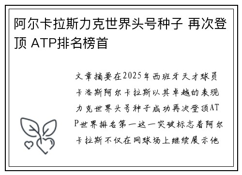 文章摘要:在2025年,西班牙天才球员卡洛斯·阿尔卡拉斯以其卓越的表现力克世界头号种子,成功再次登顶ATP世界排名第一。这一突破标志着阿尔卡拉斯不仅在网球场上继续展示他惊人的技术和心理素质,同时也巩固了他在男子网球界的领军地位。本文将从四个...