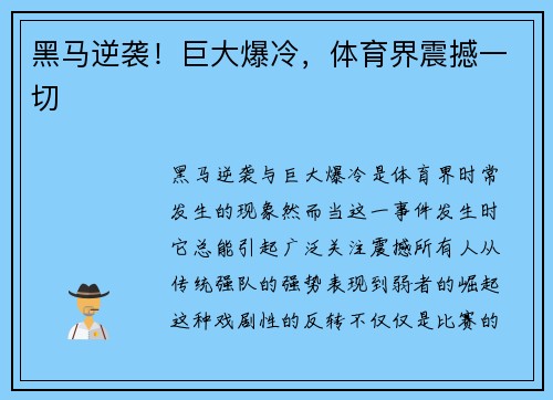 黑马逆袭!巨大爆冷,体育界震撼一切