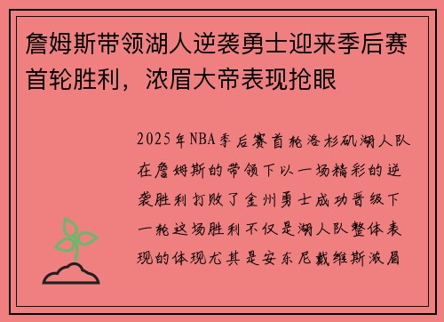 詹姆斯带领湖人逆袭勇士迎来季后赛首轮胜利,浓眉大帝表现抢眼