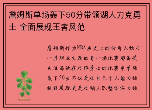 詹姆斯作为NBA历史上的传奇人物之一,其职业生涯的每一场比赛都备受关注。而他在对阵勇士的比赛中单场轰下50分,不仅是对自己个人能力的极致展现,更是对湖人队整体实力的体现。在这场比赛中,詹姆斯不仅表现出了他的进攻火力,还展现了他作为领袖的责任...