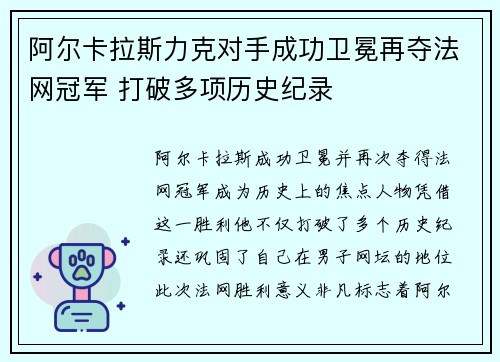 阿尔卡拉斯力克对手成功卫冕再夺法网冠军 打破多项历史纪录