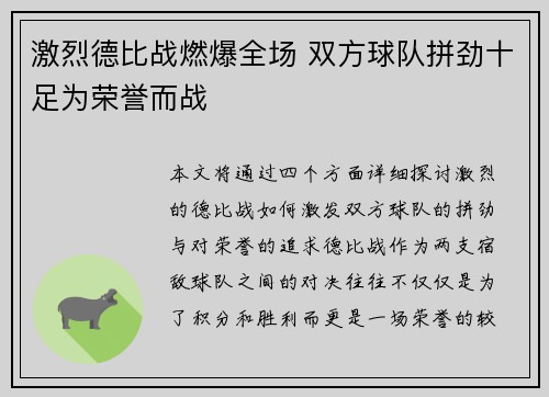本文将通过四个方面详细探讨激烈的德比战如何激发双方球队的拼劲与对荣誉的追求。德比战作为两支宿敌球队之间的对决,往往不仅仅是为了积分和胜利,而更是一场荣誉的较量,球迷的激情、球员的拼搏和主教练的战略在其中交织,形成了一场场令人难以忘怀的经典之...