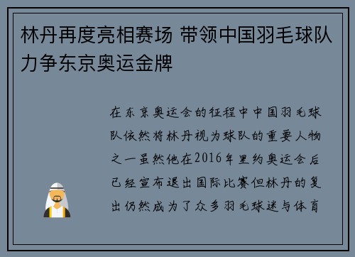 林丹再度亮相赛场 带领中国羽毛球队力争东京奥运金牌