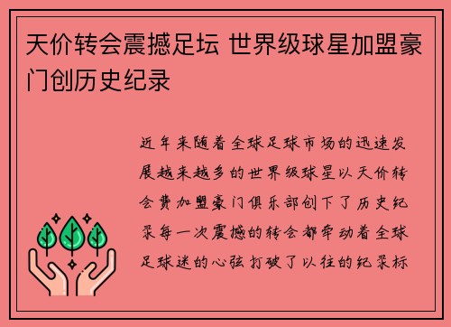 天价转会震撼足坛 世界级球星加盟豪门创历史纪录