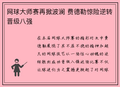 网球大师赛再掀波澜 费德勒惊险逆转晋级八强