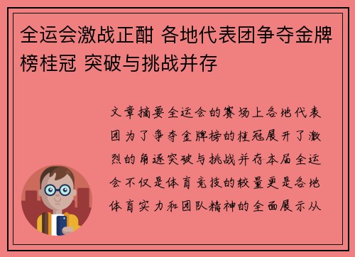 文章摘要:全运会的赛场上,各地代表团为了争夺金牌榜的桂冠展开了激烈的角逐,突破与挑战并存。本届全运会不仅是体育竞技的较量,更是各地体育实力和团队精神的全面展示。从代表团的成绩表现到运动员的突破,再到新兴项目的崛起,整个赛事充满了紧张与热血。...