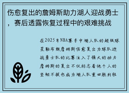 在2025年NBA赛季中,湖人队的超级球星勒布朗·詹姆斯伤愈复出,为球队迎战勇士队的比赛注入了强大的动力。詹姆斯的复出不仅标志着他个人的坚韧不拔,也成为湖人队重回胜利轨道的关键所在。赛后,詹姆斯向媒体透露了他在恢复过程中面临的种种挑战,从严...