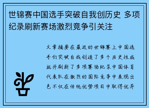 文章摘要:在最近的世锦赛上,中国选手们突破自我,创造了多个历史性成就,并刷新了多项赛场纪录。中国体育代表队在激烈的国际竞争中表现出色,不仅在传统优势项目中取得优异成绩,还在一些新的领域中展示了强大的竞争力。本文将从四个方面进行详细阐述:第一...
