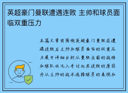本篇文章将围绕英超豪门曼联在遭遇连败后,主帅和球员面临的双重压力展开详细分析。从曼联当前的战绩和球队状况入手,讨论其连败的原因,并从主帅的战术选择、球员的表现和心理状态、球队的管理和资源分配等多个角度分析其面临的挑战。同时,也会分析曼联如何...