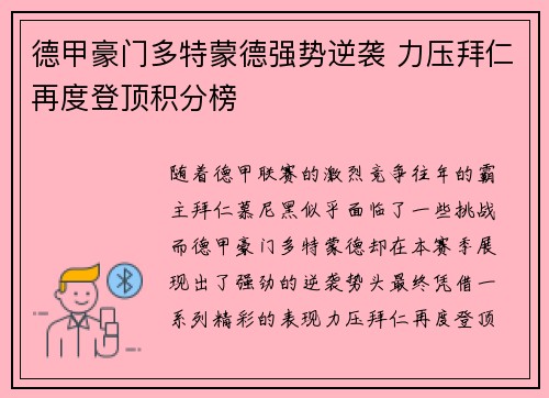 随着德甲联赛的激烈竞争,往年的霸主拜仁慕尼黑似乎面临了一些挑战,而德甲豪门多特蒙德却在本赛季展现出了强劲的逆袭势头,最终凭借一系列精彩的表现力压拜仁,再度登顶积分榜,重新站到了德国足球的巅峰。本文将从四个关键方面,详细分析多特蒙德的崛起之路...
