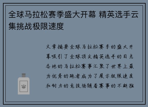 文章摘要:全球马拉松赛季的盛大开幕吸引了全球顶尖精英选手的目光,各地的马拉松赛事汇聚了世界上最为优秀的跑者,成为了展示极限速度和耐力的竞技场。随着赛事的不断推进,马拉松赛季不仅是对运动员身体素质的全面考验,更是精神和意志力的极限挑战。本文将...