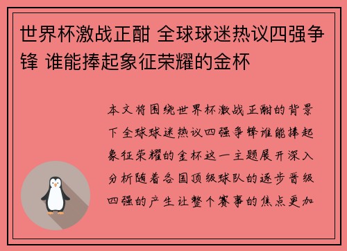 本文将围绕世界杯激战正酣的背景下,全球球迷热议四强争锋、谁能捧起象征荣耀的金杯这一主题展开深入分析。随着各国顶级球队的逐步晋级,四强的产生让整个赛事的焦点更加集中。球迷们的热情高涨,社交媒体上充满了对各队表现的讨论和预测。在这篇文章中,我们...