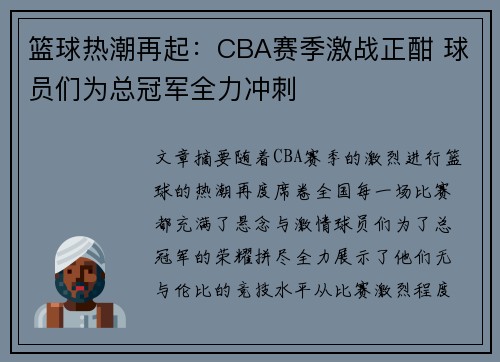篮球热潮再起:CBA赛季激战正酣 球员们为总冠军全力冲刺