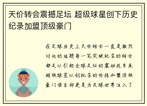 天价转会震撼足坛 超级球星创下历史纪录加盟顶级豪门