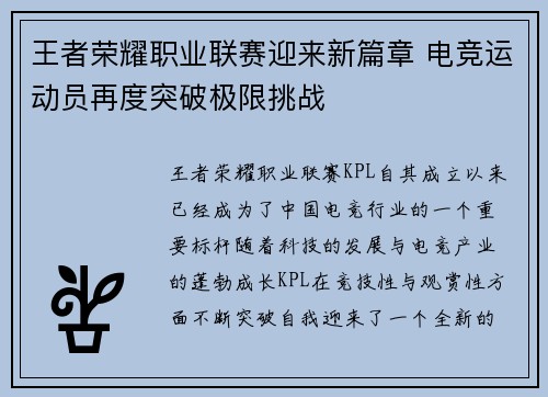 王者荣耀职业联赛(KPL)自其成立以来,已经成为了中国电竞行业的一个重要标杆。随着科技的发展与电竞产业的蓬勃成长,KPL在竞技性与观赏性方面不断突破自我,迎来了一个全新的篇章。尤其是在电竞运动员不断突破极限的挑战中,他们不仅提升了自己的竞技...