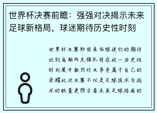 世界杯决赛前瞻:强强对决揭示未来足球新格局,球迷期待历史性时刻