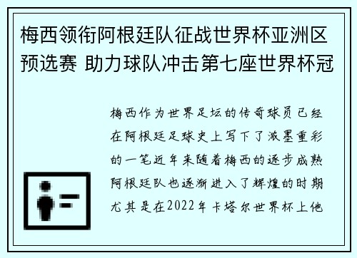 梅西领衔阿根廷队征战世界杯亚洲区预选赛 助力球队冲击第七座世界杯冠军