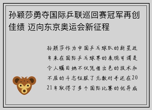 孙颖莎勇夺国际乒联巡回赛冠军再创佳绩 迈向东京奥运会新征程